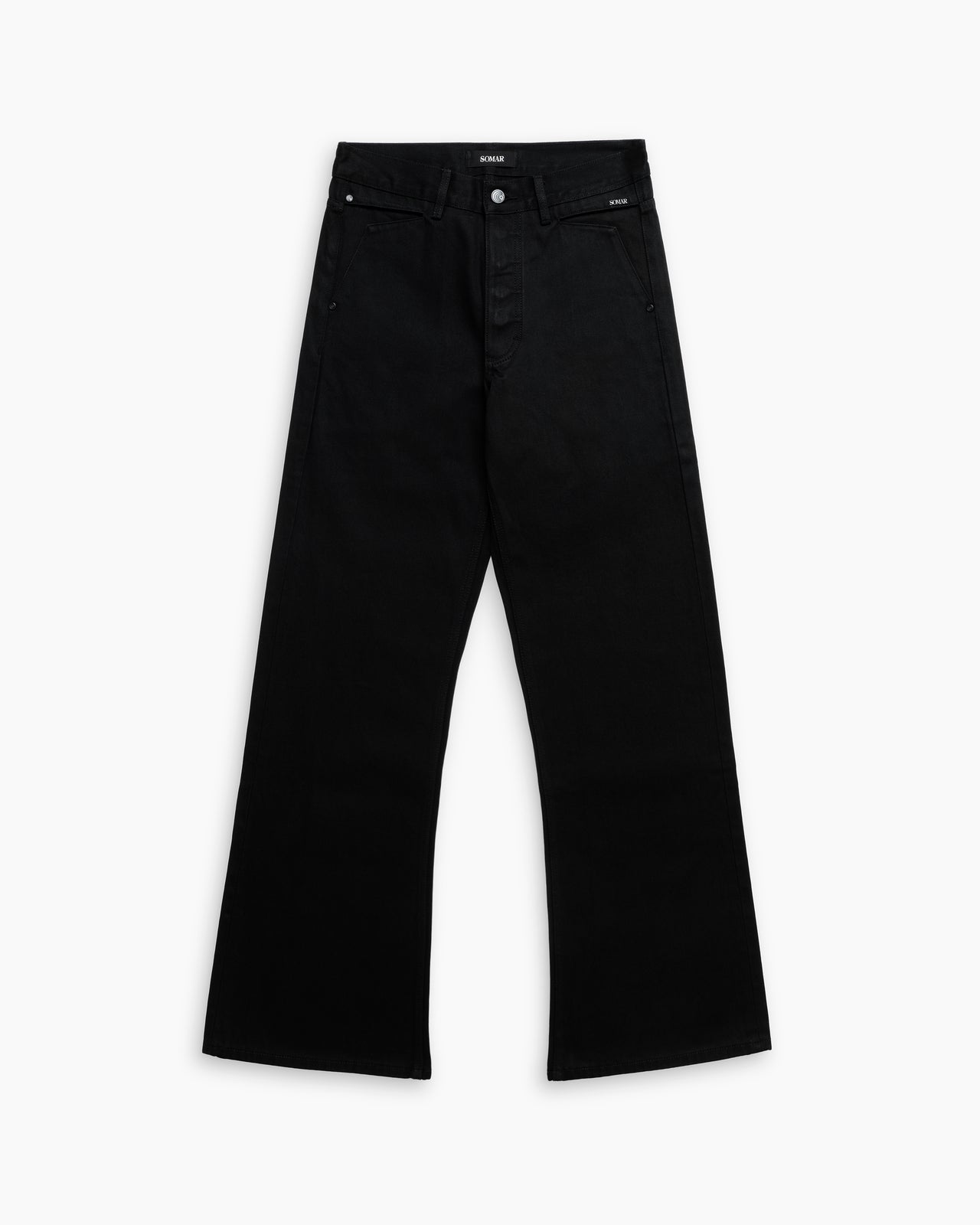 Field-issued variation of the denim series. Cut with increased volume to accommodate external gear rigging, brace systems, and lower-body armor overlays. Constructed from black denim with black-on-black configuration for uniform integration. Assigned where standard-issue fit restricts operational range.